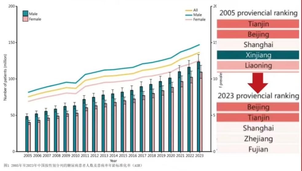 据中国疾病预防控制慢病中心2025年6月发布的最新数据,我国20岁以上糖尿病患者已达2.33亿人(95%CI:2.15-2.52亿),相当于每6个人中就有1人患病。更惊人的是,2005年到2023年,患者数从8848万激增163.36%,年龄标准化患病率从7.53% 飙至13.67%,相当于每10年翻一番。